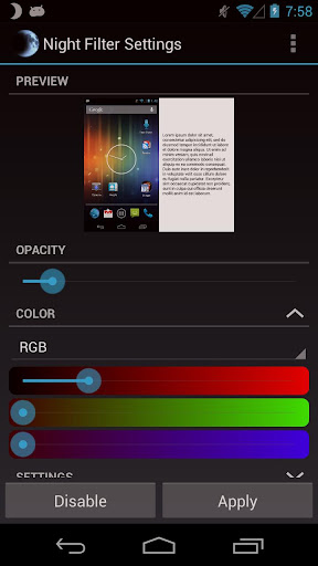 The overview contians: Night Filter is an easy to use screen filter application for your Android phone or tablet. Night Filter makes it easy for you to dim your screen, adjust your color tint, and more! Use it to read at night with less eye strain and correct for an excessive screen tint.