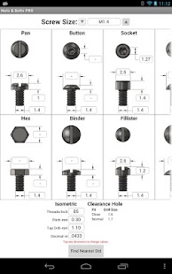 Nuts & Bolts is a simple application to look up screw sizes. It provides screw diameters, screw head dimensions, tap drill sizes, and clearance holes for standard sizes #0 to 1" and metric sizes M1.4 to M24. A simple interface allows you to cycle through sizes and screw types OR tap any dimension to quickly jump to the size you want.