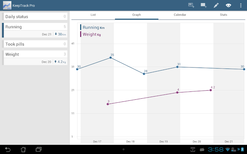 Overview: Track you life’s data with KeepTrack! Watch the trends and achieve your goals.